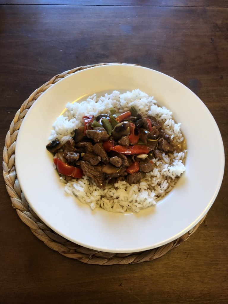 I first seared braising beef (dredged in flour, caraway seeds, salt and pepper) in olive oil, then fried some onions and garlic in the beefy juices. I deglazed the pan with madeira (didn’t have any sherry) and then stir-fried some green peppers, mushrooms, and a bit of ginger I had knocking around (not in the original recipe). I deglazed the pan again with water and then added soy sauce and sugar, chucked that in with another can of consomme into the slow-cooker for good measure (chicken this time – not sure if it’ll make much of a difference). The most important thing for this recipe is to add corn flour at the end of the cooking time to thicken the sauce (the best bit in my opinion). I’ll have to wait an hour or two for this. I should have left the peppers and mushrooms until the end so they stay toothier but I like how they add to the sauce flavour. I might add some flash-fried red peppers at the end to add some crunch. [Edit: totally forgot to add the all-important Anglo special: vinegar! Couldn’t put my finger on what was wrong with it, then remembered, added a couple of tablespoons, another teaspoon of sugar et voila!]